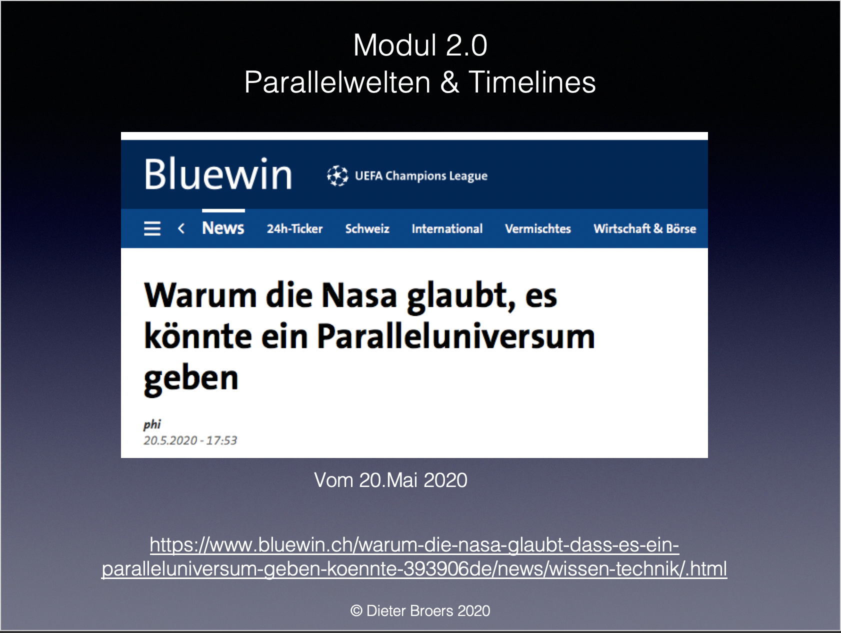 Das Thema der Parallelwelten und Timelines wird besonders von den Physikern seit Jahrzehnten erforscht. Bisher galt das Modell der sogenannten Multi-Welten als ein eher theoretisches Modell, wenngleich es zu den wahrscheinlichsten kosmologischen Theorien zählt. In einem Multi-Welt-Modell, also einer Welt, in der sehr viele Paralleluniversen neben unseren Universen existieren, würde es uns beispielsweise in verschiedenen Versionen geben. Seit Beginn 2020 scheint es Hinweise zu geben, dass diese Parallelwelten tatsächlich existieren. In diesem Modul werde ich der Frage nachgehen, ob diese neuesten Beobachtungen etwas mit unserem Aufstieg zu tun haben. Oder ob diese Beobachtungen in einem Zusammenhang mit einer Teilung unserer Zeitlinie stehen könnte bzw. im Kontext einer Teilung zwischen Erde Eins und einer Erde 2.0 steht.