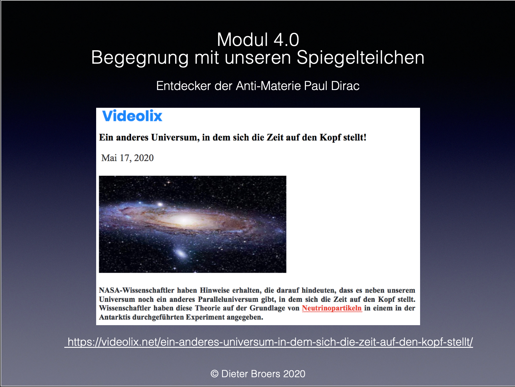 Zumindest für die Physiker zählen die Spiegelteilchen zur Antimaterie. Ohne sie wäre unsere Welt nicht möglich. Das konnte einer der Mitbegründer der Quantenphysik und Nobelpreisträger Paul Dirac bereits Anfang der dreißiger Jahre herleiten. Seine Berechnungen wurden 1932 durch den Experimentalphysiker Carl Anderson bestätigt. Carl Anderson konnte tatsächlich die ersten Antiteilchen in den kosmischen Strahlen nachweisen. Die Voraussage und anschließende Entdeckung eines Antiteilchens gehörten zu den größten Triumphen des 20. Jahrhunderts. Doch sind unsere Spiegelteilchen tatsächlich parallele Selbste von uns? Und könnten sich unsere parallelen Selbste möglicherweise gar mit uns vereinigen?