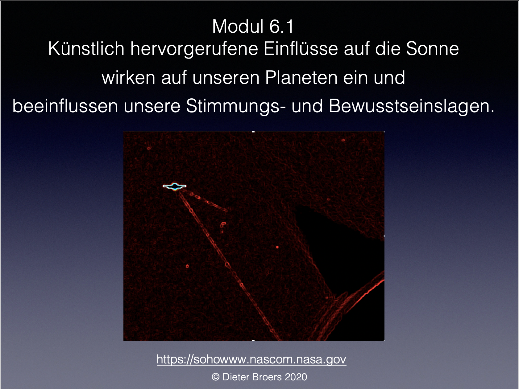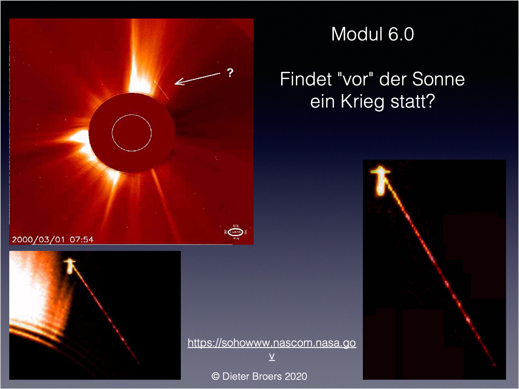 Als ich 1996 anfing, mir die Sonnenaufnahmen des NASA-Satelliten Soho anzuschauen, ahnte ich nicht, in welches Abenteuer ich mich damit begeben sollte. Was ich zu Gesicht bekam, erschien mir derartig unverständlich und mysteriös, dass ich mir hierfür professionelle Hilfe holte. Diese Hilfe, die ich erhielt, bestand vorerst darin, dass ich nun wusste, dass es sich bei meinen Aufnahmen weder um Pixel-Fehler noch um Artefakte handeln würde. Diese Objekte tauchten quasi spontan in der Nähe der Sonne auf und verschwanden genauso mysteriös, wie sie gekommen waren. Noch merkwürdiger war es, dass diese unbekannten Objekte laserähnliche Strahlen absenden konnten, die wie Geschosse aussahen. Eine professionelle Analyse zeigt, dass diese Objekte offenbar untereinander einen Konflikt auszutragen hatten. Die entsprechenden Satellitenaufnahmen zeigten auch, dass eine spezielle Art dieser Objekte, die sich äußerlich von anderen Objekten unterschieden, auf die Sonne Geschosse abgaben, während andere Objekte dieses zu verhindern suchten. Nach eingehender Analyse und Bewertung der vorliegenden Aufnahmen scheint es tatsächlich so zu sein, dass die kosmisch orchestrierte Metamorphose von einigen Entitäten verhindert werden soll. Andere wiederum möchten sie zulassen. Bei meinem Versuch, diese seltsamen Aufnahmen zu veröffentlichen, geriet ich in ernsthafte Schwierigkeiten, was sicherlich auch einer der Gründe war, dass ich bis jetzt damit gewartet habe, sie euch zu präsentieren. Wenn ich nicht absolut davon überzeugt wäre, dass nun genau der passende Zeitpunkt erreicht ist, euch diese bedeutsamen Aufnahmen zu zeigen, hätte ich diesen Schritt nicht getan. Ich werde euch im letzten Modul in meiner Zusammenfassung zeigen, dass auch diese bizarr erscheinenden Ereignisse im Zusammenhang mit der jetzt stattfindenden Metamorphose stehen, dem Erwachen der Menschheit.