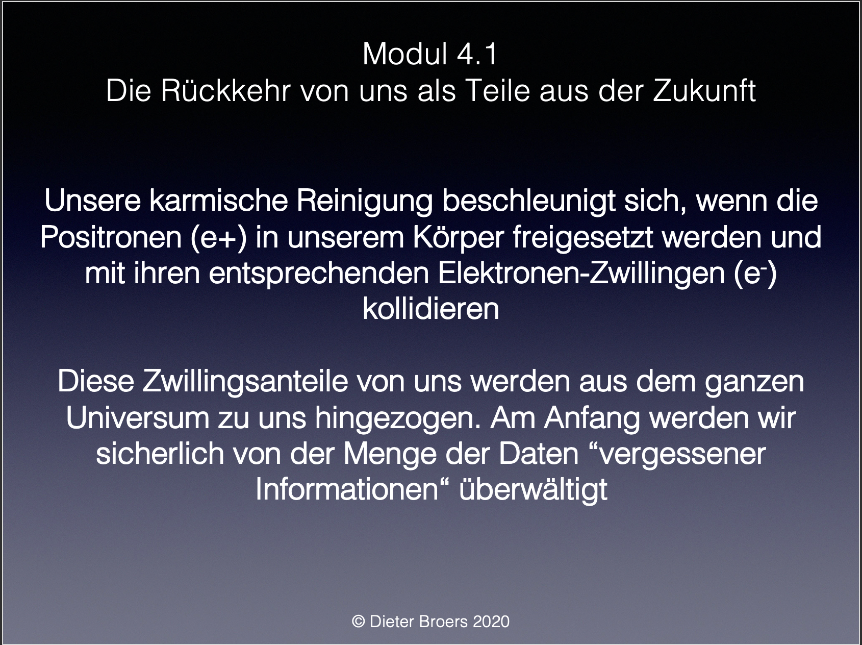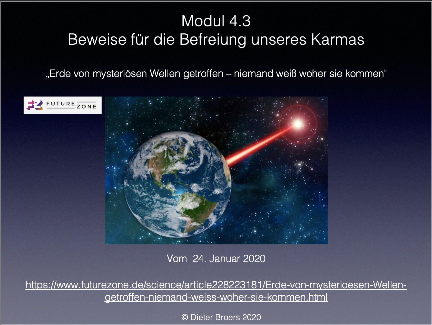 Neueste Veröffentlichungen aus der Grundlagenforschung sprechen dafür, dass wir tatsächlich mit unseren Spiegelteilchen konfrontiert werden. Bei diesen Spiegelteilchen spielen die hochenergetischen Gammastrahlen eine besondere Rolle. Aus der Quantenphysik können wir erfahren, dass diese Gammastrahlen sogar in der Lage sind, unsere gespeicherten Informationen freizulegen. In besonderem Maße wären hier die Erinnerung an vergangene Traumata betroffen. Die physikalische Grundlage für diese Theorie erstellte der Physiker John Chambers durch seine komplexe Relativitätstheorie. Zum großen Erstaunen der Physiker treten diese Energien in Form von Gammastrahlen immer häufiger auf. Auch werden immer wieder neue Rekorde, was die Intensität ihrer Energie betrifft, aufgestellt. Könnte die Begegnung mit uns aus der Zukunft sogar dazu führen, dass unser angesammeltes Karma aufgelöst wird? Und was würde das für Konsequenzen für uns haben können?