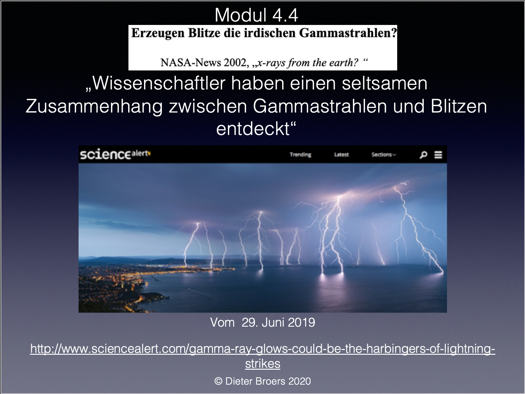 Sind die zunehmenden Blitze auf unserer Erde ein Indikator für unser Erwachen und der damit verbundenen Auflösung unseres Karmas? Zumindest quantenphysikalisch besteht auf Grundlage der bereits beschriebenen komplexen Relativitätstheorie die reale Möglichkeit einer Freilegung und Auflösung des abgespeicherten Karmas. Wie ich bereits in den vorherigen Modulen gezeigt habe, spielen hierbei die Gammastrahlen eine entscheidende Rolle. Diese Gammastrahlen treten offenbar in einem Zusammenhang mit den so genannten Spiegelteilchen auf. Dass diese Gammastrahlen nun sogar zunehmend von der Erde kommen und dort von hochenergetischen Blitzen erzeugt werden, spricht tatsächlich für den Beginn des Prozesses einer möglichen Karmaauflösung. Bisher gingen Wissenschaftler davon aus, dass Gammastrahlen ausschließlich aus den Weiten des Kosmos stammen. Zu ihrem großen Erstaunen konnten Sie nun auch irdische Gammastrahlen nachweisen. In diesem Modul werde ich also näher auf die Zusammenhänge zwischen den zunehmend erscheinenden irdischen Gammastrahlen und den damit einhergehenden psychischen Auffälligkeiten eingehen.