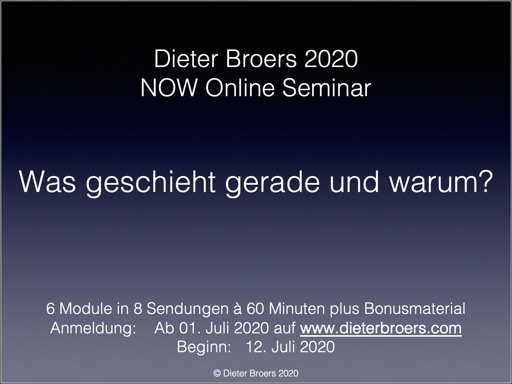 Liebe Freunde, ich habe in den vergangenen 30 Jahren einen Großteil der Basisinformationen zusammengetragen und sie mit den aktuellen Ergebnissen abgeglichen. Dadurch ist nun ein Gesamtbild entstanden, welches eindeutig erkennen lässt, dass wir uns inmitten eines einzigartigen Szenarios befinden. Das ist der Grund, aus dem ich mich entschlossen habe, die einzelnen anderen Seminare, die ich bereits angekündigt hatte, nur in ein einziges Seminar zusammenzulegen. Mitte Juli soll es nun losgehen. Ich hoffe, ihr seid dabei. Liebe Freunde!