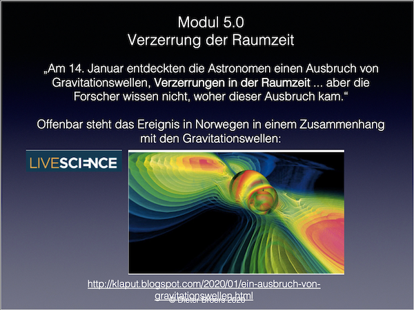 Angeblich steht diese Raumzeit-Verzerrung im ursächlichen Zusammenhang mit Gravitationswellen. Nach Sichtung des mir vorliegenden Datenmaterials weist diese Raumzeit-Verzerrung darauf hin, dass wir uns inmitten einer kosmischen Metamorphose befinden.